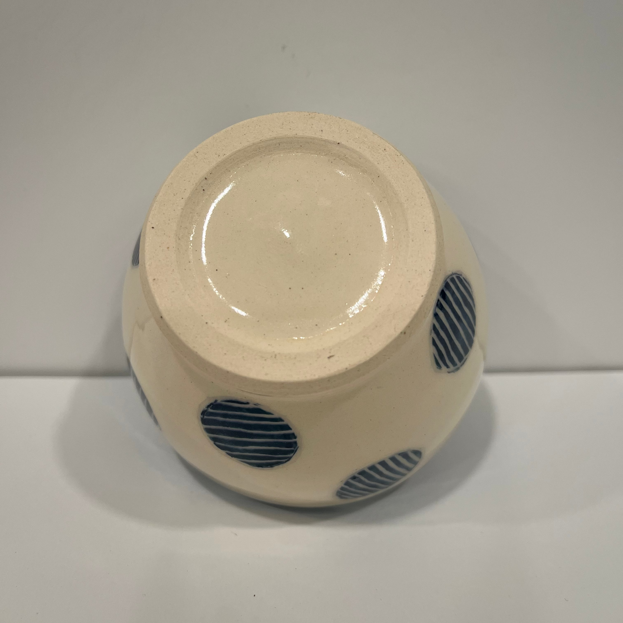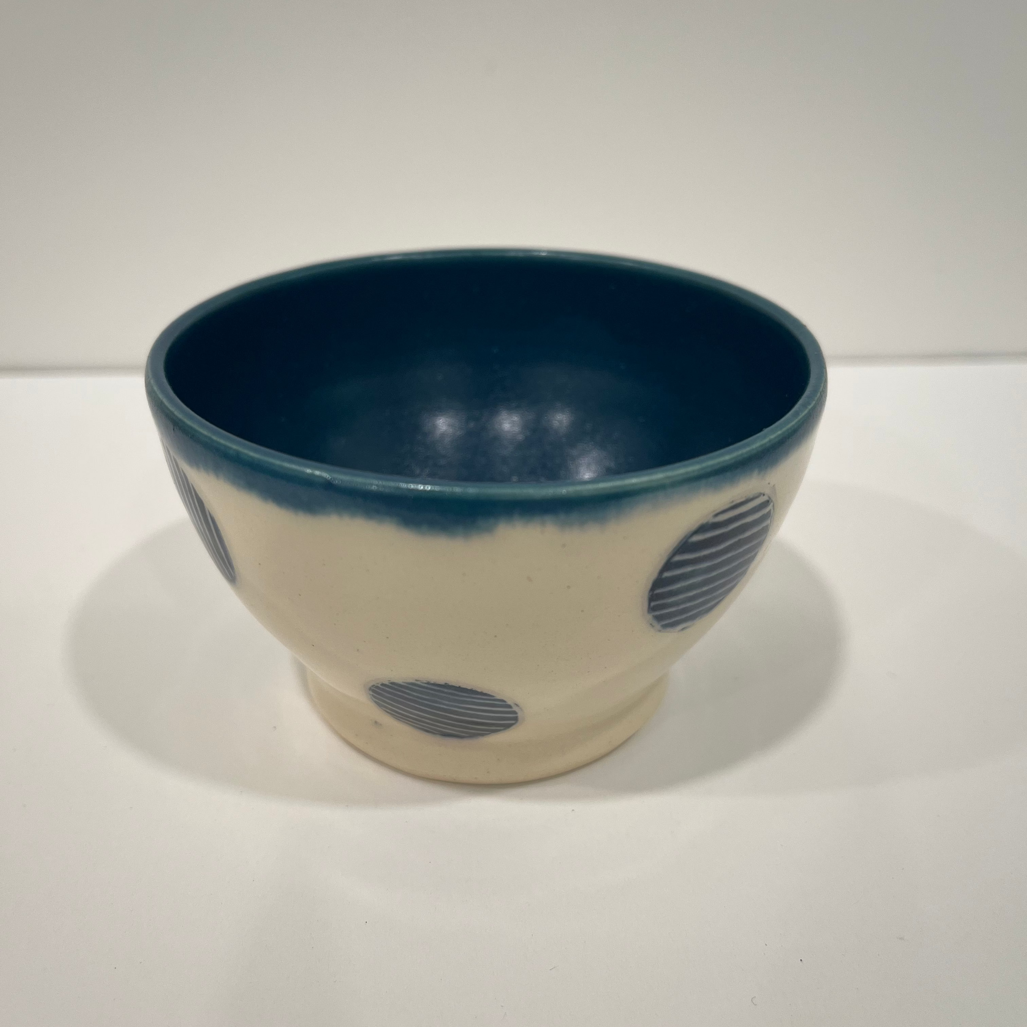 Petite Blue Polka Dot Pottery Bowl measures approximately 3.5" x 3.5" x 2.25" tall.