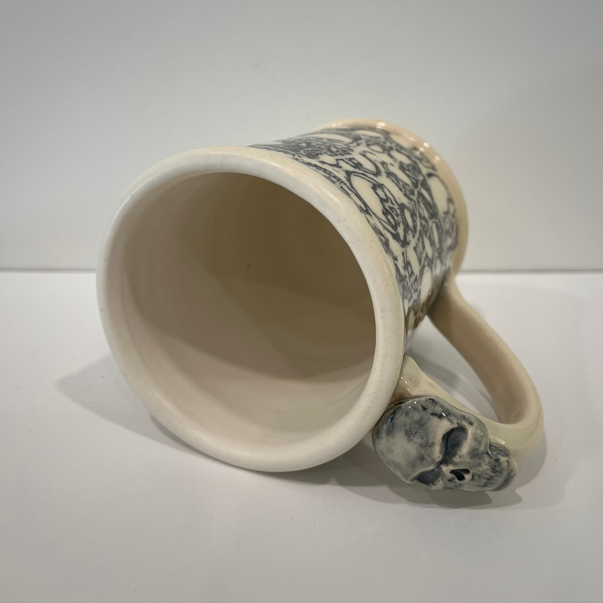 • Load image into Gallery viewer, Pottery mug with black skull pattern on white background.