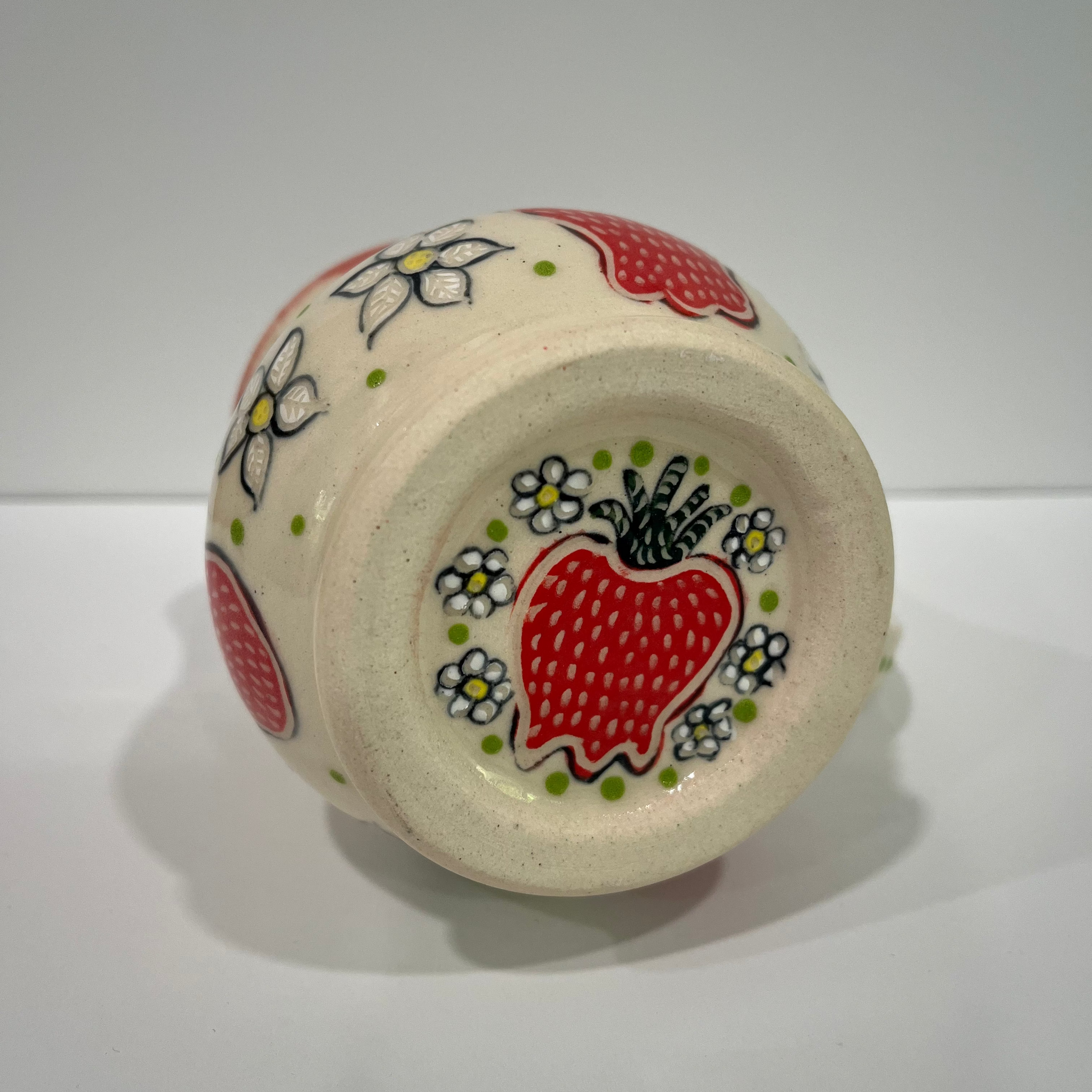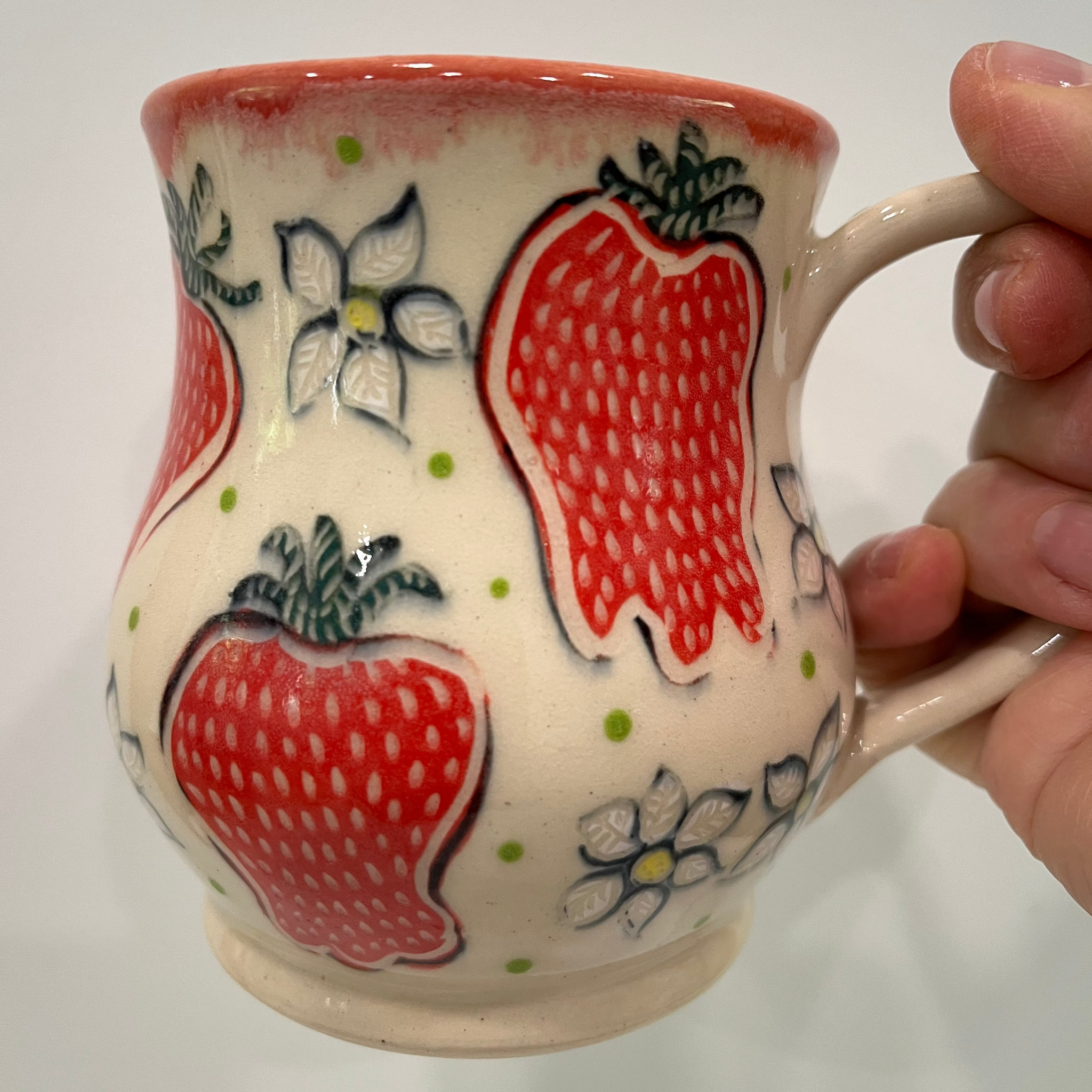 Strawberry Pottery Mug measures approximately 3.25" x 3.25" x 4" tall.